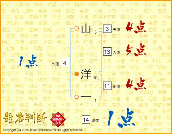 生活面を象徴する運勢です。外部から受ける影響力を表し、結婚運、家庭運や職場、環境への順応性を表します。総運から人運を引いた画数。姓や名が1文字の場合を除く。