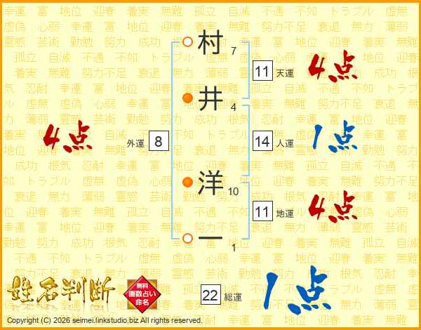 生活面を象徴する運勢です。外部から受ける影響力を表し、結婚運、家庭運や職場、環境への順応性を表します。総運から人運を引いた画数。姓や名が1文字の場合を除く。
