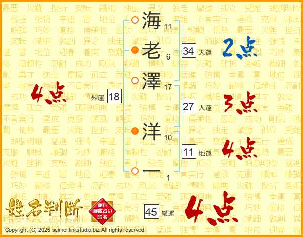 海(11画)老(6画)澤(17画) 洋(10画)一(1画)