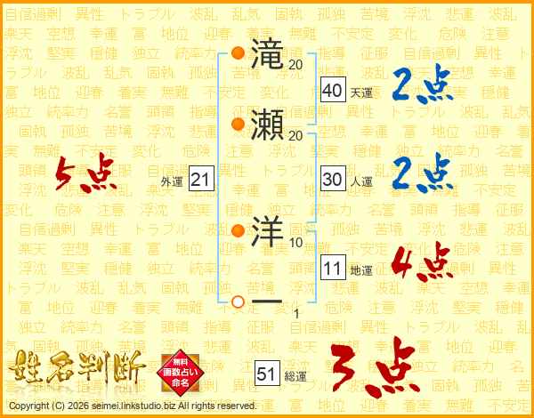 滝(20画)瀬(20画) 洋(10画)一(1画)