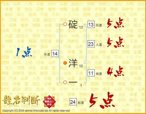 生活面を象徴する運勢です。外部から受ける影響力を表し、結婚運、家庭運や職場、環境への順応性を表します。総運から人運を引いた画数。姓や名が1文字の場合を除く。