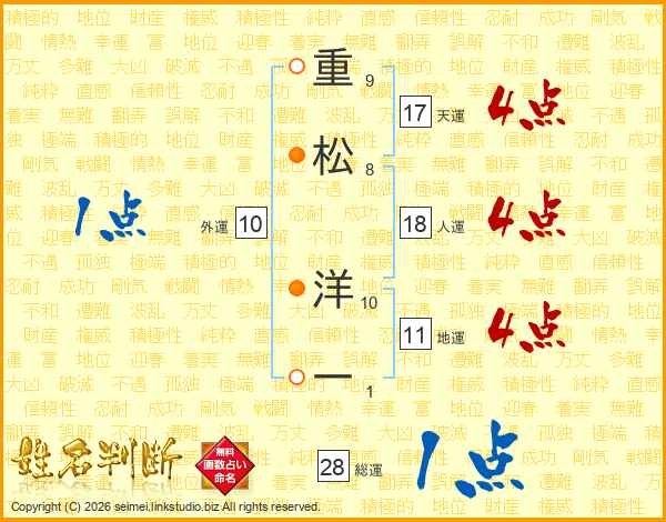 あなたの人生を表す1番重要な運勢です。生涯を通じて影響する総合運となり、主に50歳以降の晩年期に影響を及ぼします。苗字と名前の合計画数。