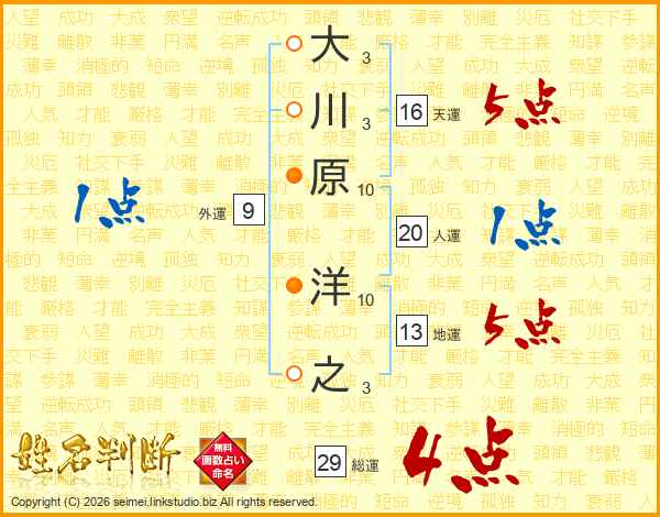 あなたの人生を表す1番重要な運勢です。生涯を通じて影響する総合運となり、主に50歳以降の晩年期に影響を及ぼします。苗字と名前の合計画数。