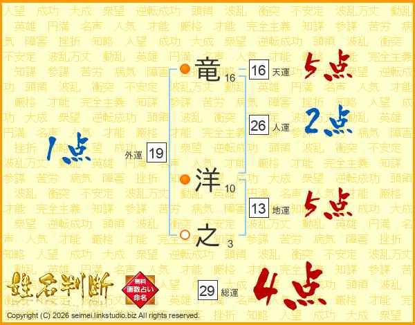 竜洋之さんの天運は16画の5点!