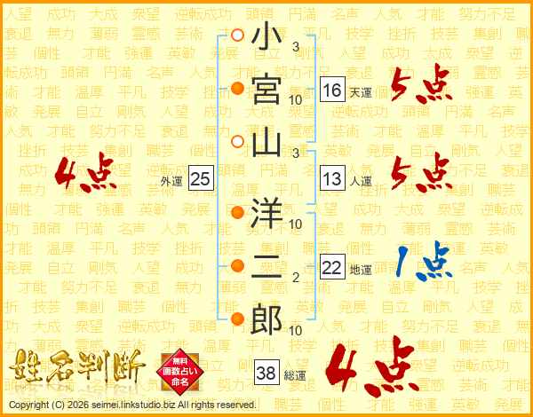 小(3画)宮(10画)山(3画) 洋(10画)二(2画)郎(10画)