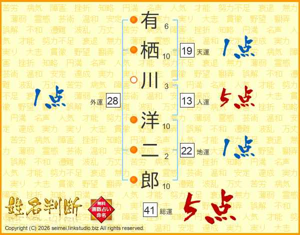 有栖川洋二郎さんの総運は41画の5点!