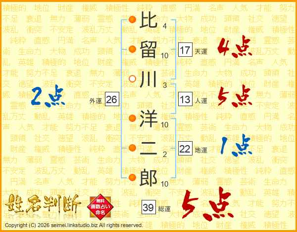 比(4画)留(10画)川(3画) 洋(10画)二(2画)郎(10画)