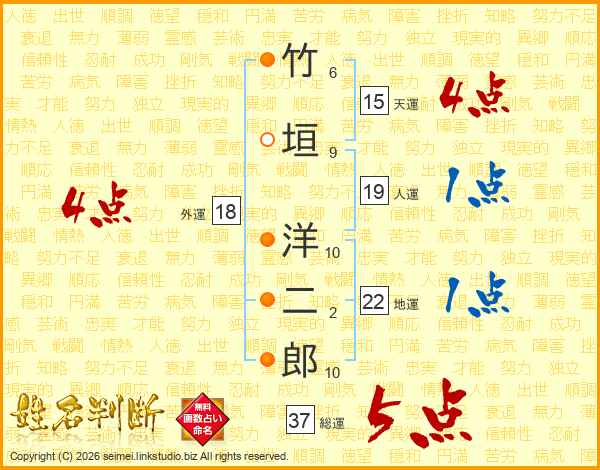 竹(6画)垣(9画) 洋(10画)二(2画)郎(10画)