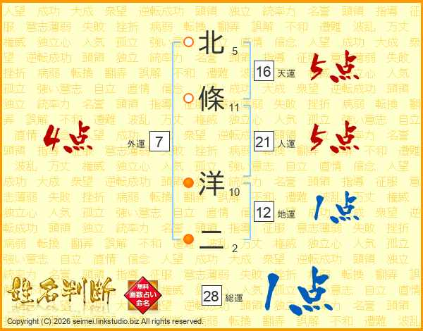 生活面を象徴する運勢です。外部から受ける影響力を表し、結婚運、家庭運や職場、環境への順応性を表します。総運から人運を引いた画数。姓や名が1文字の場合を除く。