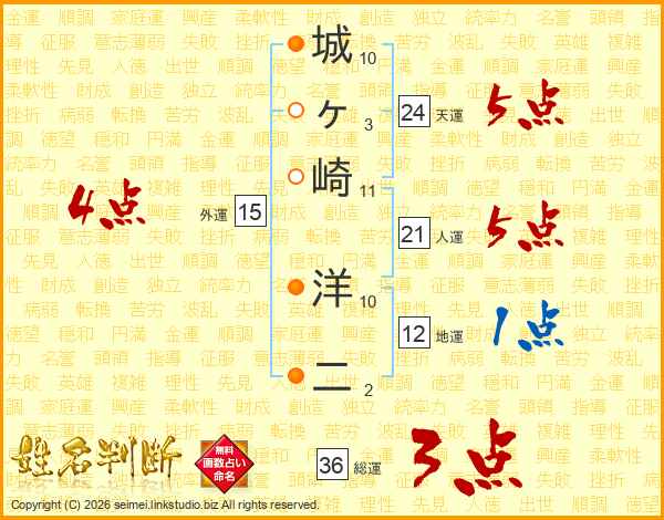 城(10画)ヶ(3画)崎(11画) 洋(10画)二(2画)