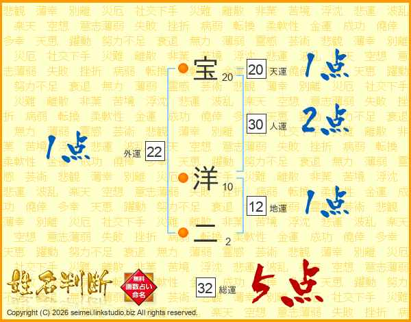 宝洋二さんの総運は32画の5点!