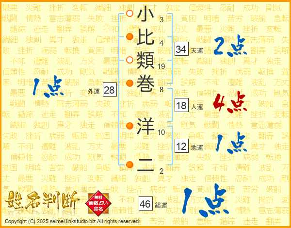 生活面を象徴する運勢です。外部から受ける影響力を表し、結婚運、家庭運や職場、環境への順応性を表します。総運から人運を引いた画数。姓や名が1文字の場合を除く。