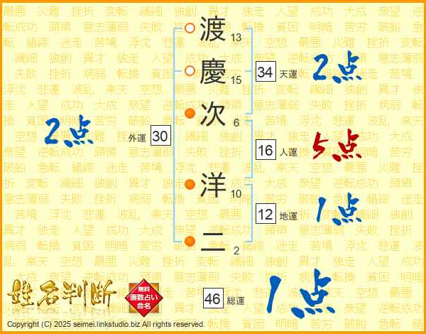 渡(13画)慶(15画)次(6画) 洋(10画)二(2画)