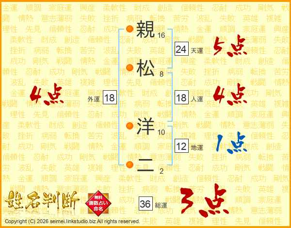 生活面を象徴する運勢です。外部から受ける影響力を表し、結婚運、家庭運や職場、環境への順応性を表します。総運から人運を引いた画数。姓や名が1文字の場合を除く。