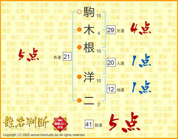 駒木根洋二さんの総運は41画の5点!