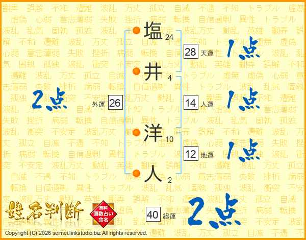 生活面を象徴する運勢です。外部から受ける影響力を表し、結婚運、家庭運や職場、環境への順応性を表します。総運から人運を引いた画数。姓や名が1文字の場合を除く。