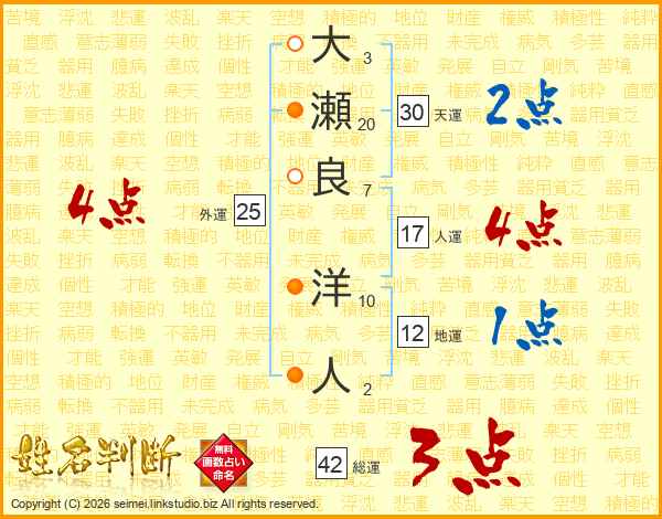 大(3画)瀬(20画)良(7画) 洋(10画)人(2画)
