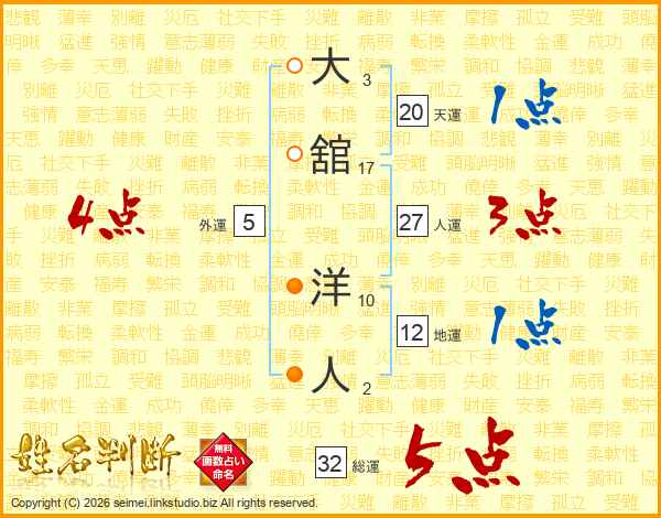 大舘洋人さんの総運は32画の5点!