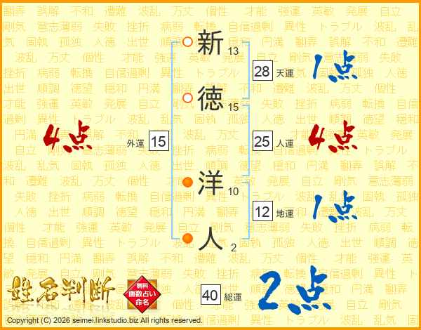生活面を象徴する運勢です。外部から受ける影響力を表し、結婚運、家庭運や職場、環境への順応性を表します。総運から人運を引いた画数。姓や名が1文字の場合を除く。