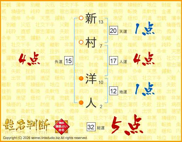 生活面を象徴する運勢です。外部から受ける影響力を表し、結婚運、家庭運や職場、環境への順応性を表します。総運から人運を引いた画数。姓や名が1文字の場合を除く。
