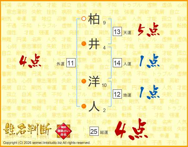生活面を象徴する運勢です。外部から受ける影響力を表し、結婚運、家庭運や職場、環境への順応性を表します。総運から人運を引いた画数。姓や名が1文字の場合を除く。