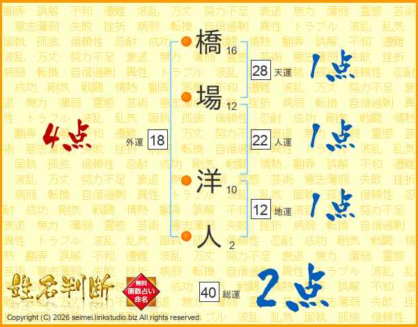 生活面を象徴する運勢です。外部から受ける影響力を表し、結婚運、家庭運や職場、環境への順応性を表します。総運から人運を引いた画数。姓や名が1文字の場合を除く。