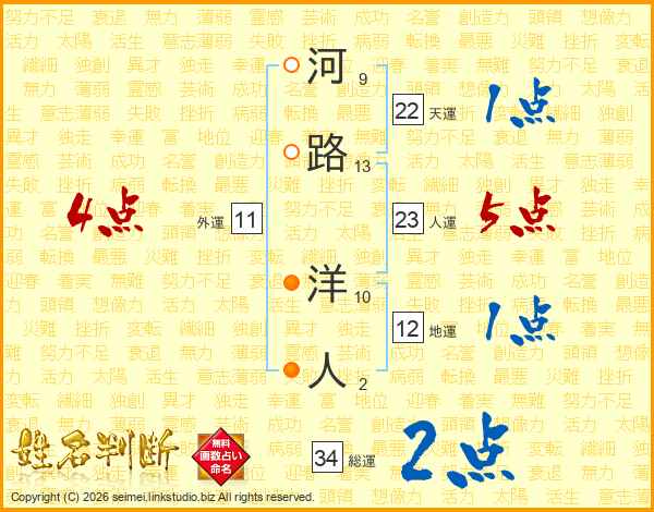 生活面を象徴する運勢です。外部から受ける影響力を表し、結婚運、家庭運や職場、環境への順応性を表します。総運から人運を引いた画数。姓や名が1文字の場合を除く。