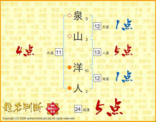 泉(9画)山(3画) 洋(10画)人(2画)