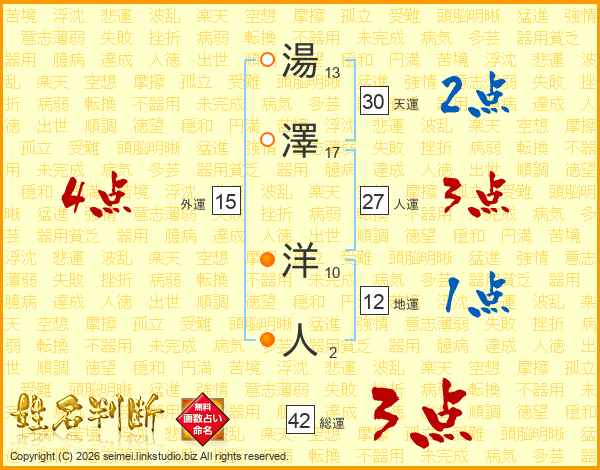 湯(13画)澤(17画) 洋(10画)人(2画)