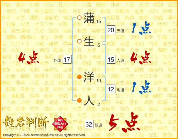 蒲(15画)生(5画) 洋(10画)人(2画)