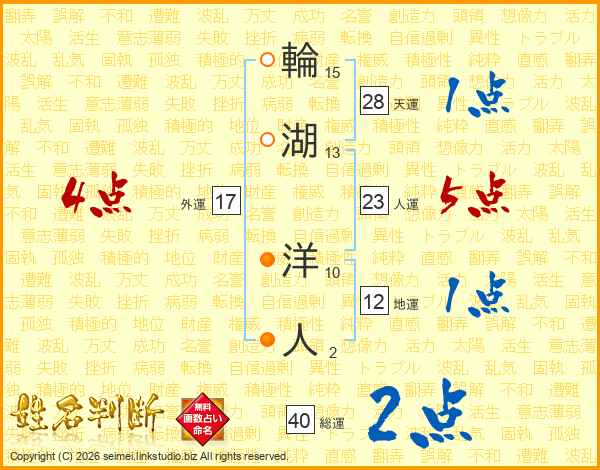 輪湖洋人さんの総運は40画の2点!