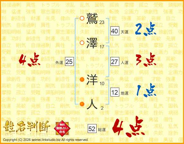鷲(23画)澤(17画) 洋(10画)人(2画)