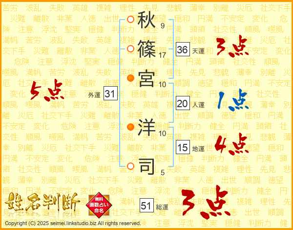 秋(9画)篠(17画)宮(10画) 洋(10画)司(5画)