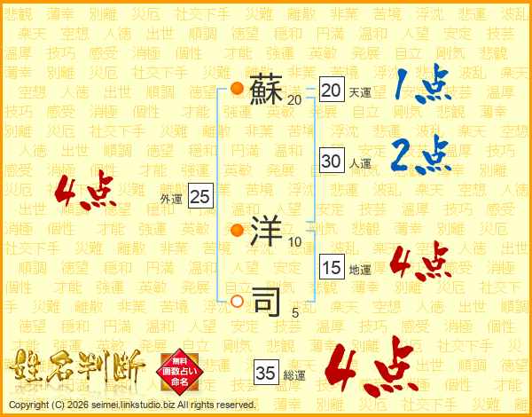 生活面を象徴する運勢です。外部から受ける影響力を表し、結婚運、家庭運や職場、環境への順応性を表します。総運から人運を引いた画数。姓や名が1文字の場合を除く。