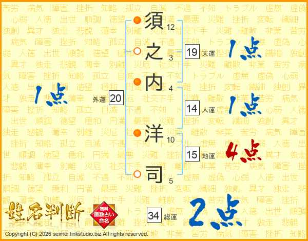 あなたの人生を表す1番重要な運勢です。生涯を通じて影響する総合運となり、主に50歳以降の晩年期に影響を及ぼします。苗字と名前の合計画数。