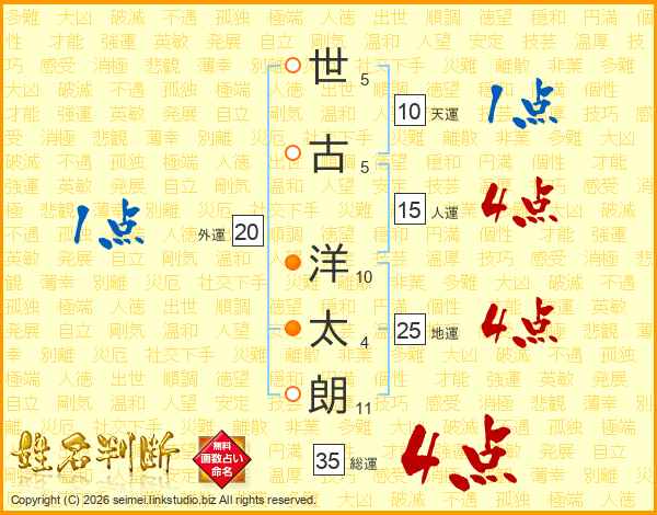 世(5画)古(5画) 洋(10画)太(4画)朗(11画)