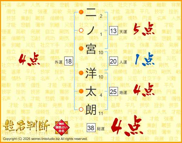 二ノ宮洋太朗さんの総運は38画の4点!