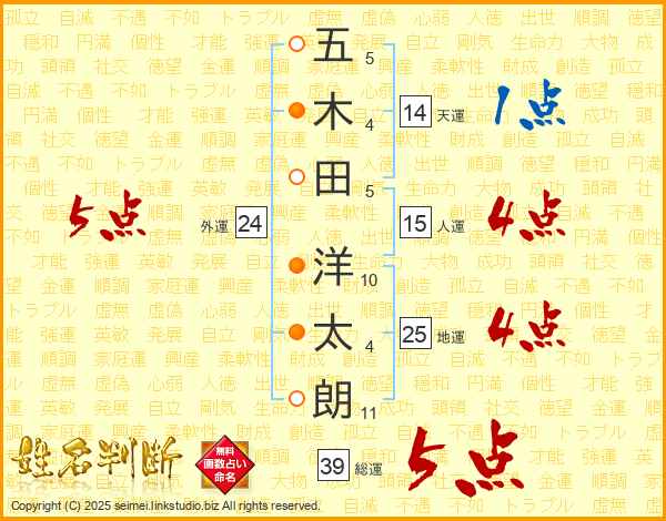 五(5画)木(4画)田(5画) 洋(10画)太(4画)朗(11画)