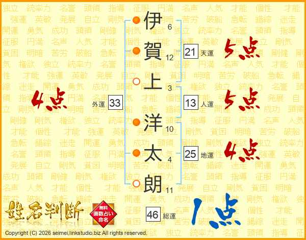 伊(6画)賀(12画)上(3画) 洋(10画)太(4画)朗(11画)