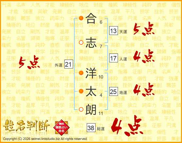 合(6画)志(7画) 洋(10画)太(4画)朗(11画)