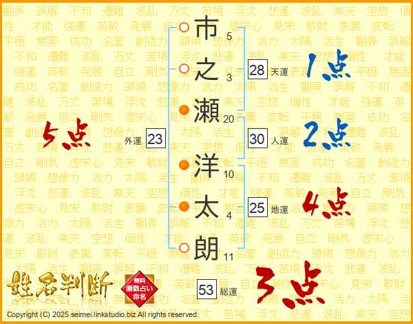 市(5画)之(3画)瀬(20画) 洋(10画)太(4画)朗(11画)