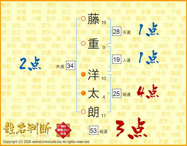 藤(19画)重(9画) 洋(10画)太(4画)朗(11画)