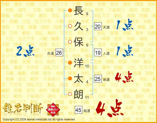 長(8画)久(3画)保(9画) 洋(10画)太(4画)朗(11画)