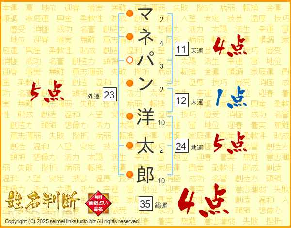 マ(2画)ネ(4画)パ(3画)ン(2画) 洋(10画)太(4画)郎(10画)