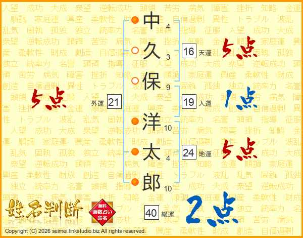 中(4画)久(3画)保(9画) 洋(10画)太(4画)郎(10画)