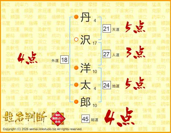 丹(4画)沢(17画) 洋(10画)太(4画)郎(10画)