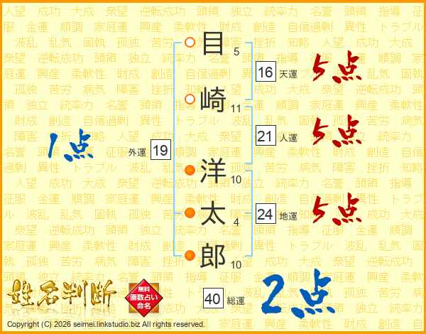 目(5画)崎(11画) 洋(10画)太(4画)郎(10画)