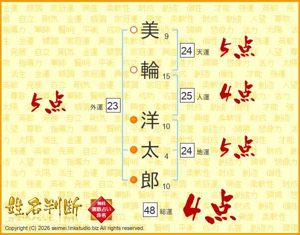 美(9画)輪(15画) 洋(10画)太(4画)郎(10画)