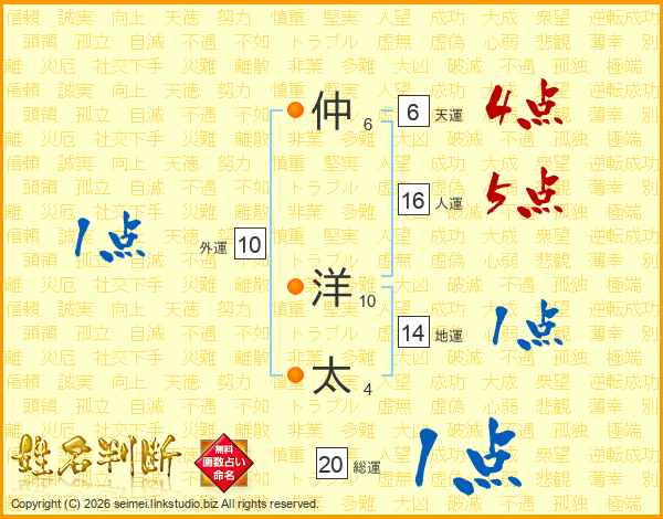 仲(6画) 洋(10画)太(4画)