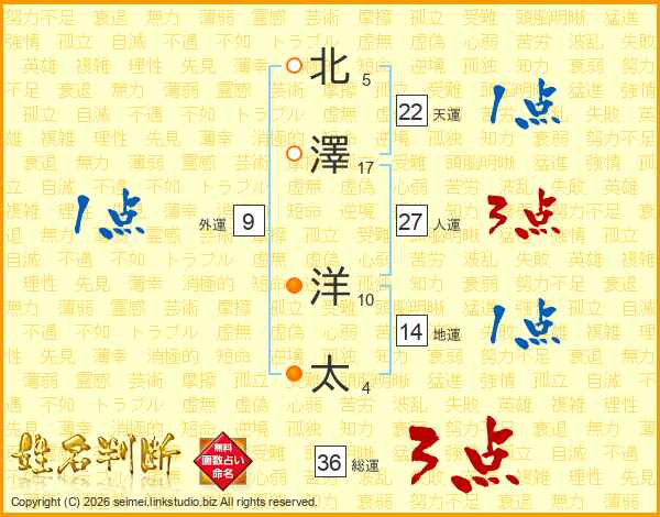 生活面を象徴する運勢です。外部から受ける影響力を表し、結婚運、家庭運や職場、環境への順応性を表します。総運から人運を引いた画数。姓や名が1文字の場合を除く。